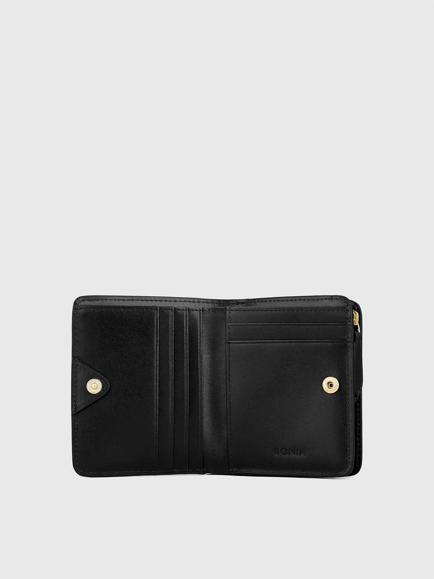 Sleek sophistication — the Eleni Compact Wallet closes seamlessly flat, offering an effortless cool look. Feature a Nappa leather exterior with brush gold accessories, it adds a touch of classic luxury to the rest of your essentials.