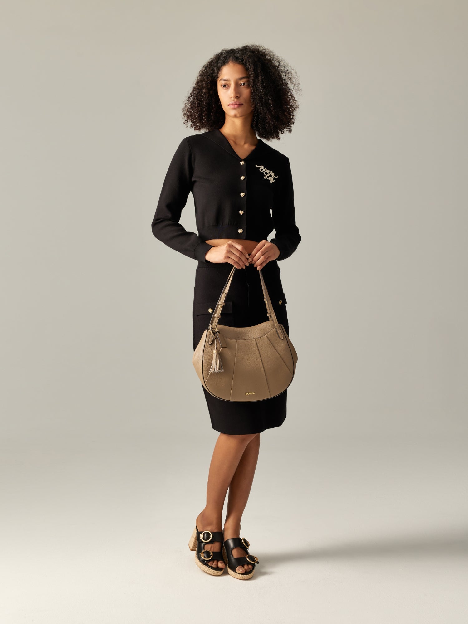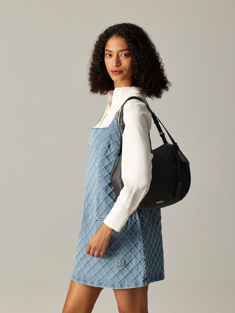 Elegant flair — the Lucille Shoulder Bag features a La Luna logo and milled leather exterior that exudes its luxury. Paired with brush gold accessories, it carries essentials with ease while matching outfits effortlessly every time.